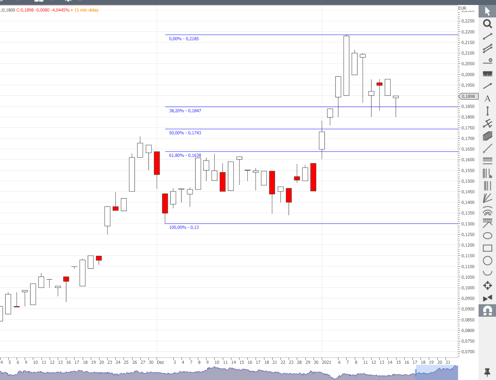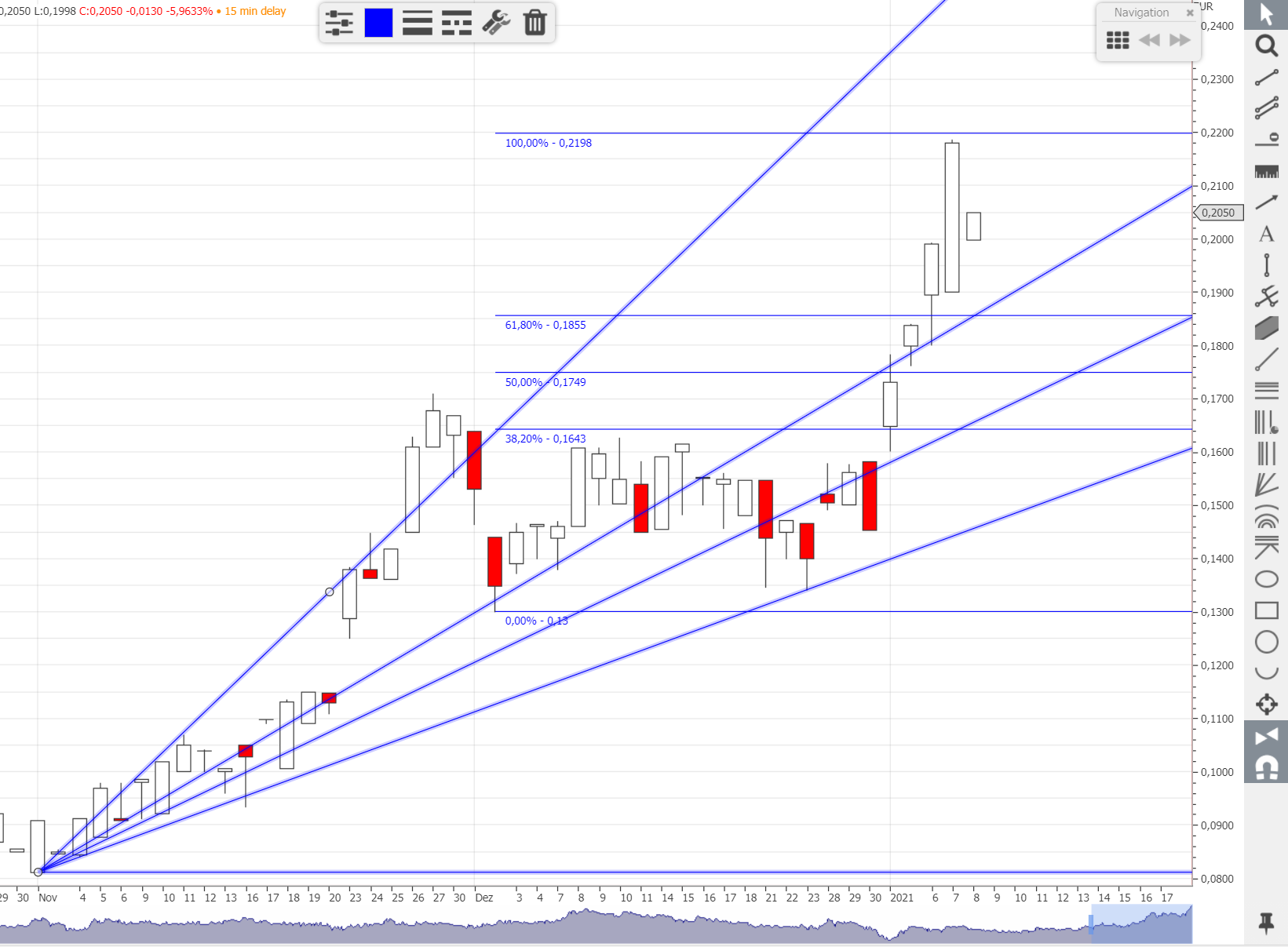 Meine Prognose hat sich erfüllt. Der Wert oszilliert nun an der oberen Trendkanalkante. Das ist charttechnisch recht spannend, wenn er wirklich einen downmove macht, so wie es hier von einigen Usern vermutet wurde, wäre jetzt (binnen der nächsten 2 Handelstage) der Zeitpunkt, dass Kurs den Henkel macht. Um anstelle dessen aus diesem Muster auszubrechen, müsste er ein eindeutiges Signal setzen. Derzeit liegt der Wert lehrbuchmäßig genau an dem Punkt im Extensionslevel, an dem Widerstand in die Unterstützung übergeht. Charttechnisch hat sich Wert für den oberen Fächerkeil entschieden. Wenn er es schafft, nachhaltig die 0,22€ zu überspringen, ist das ein Indiz, dass der Wert den Aufwärtstrend fortsetzt und ggf. sogar in andere Dimension des Wachstums will. Das wäre eine Chance neues Frischgeld anzulocken.