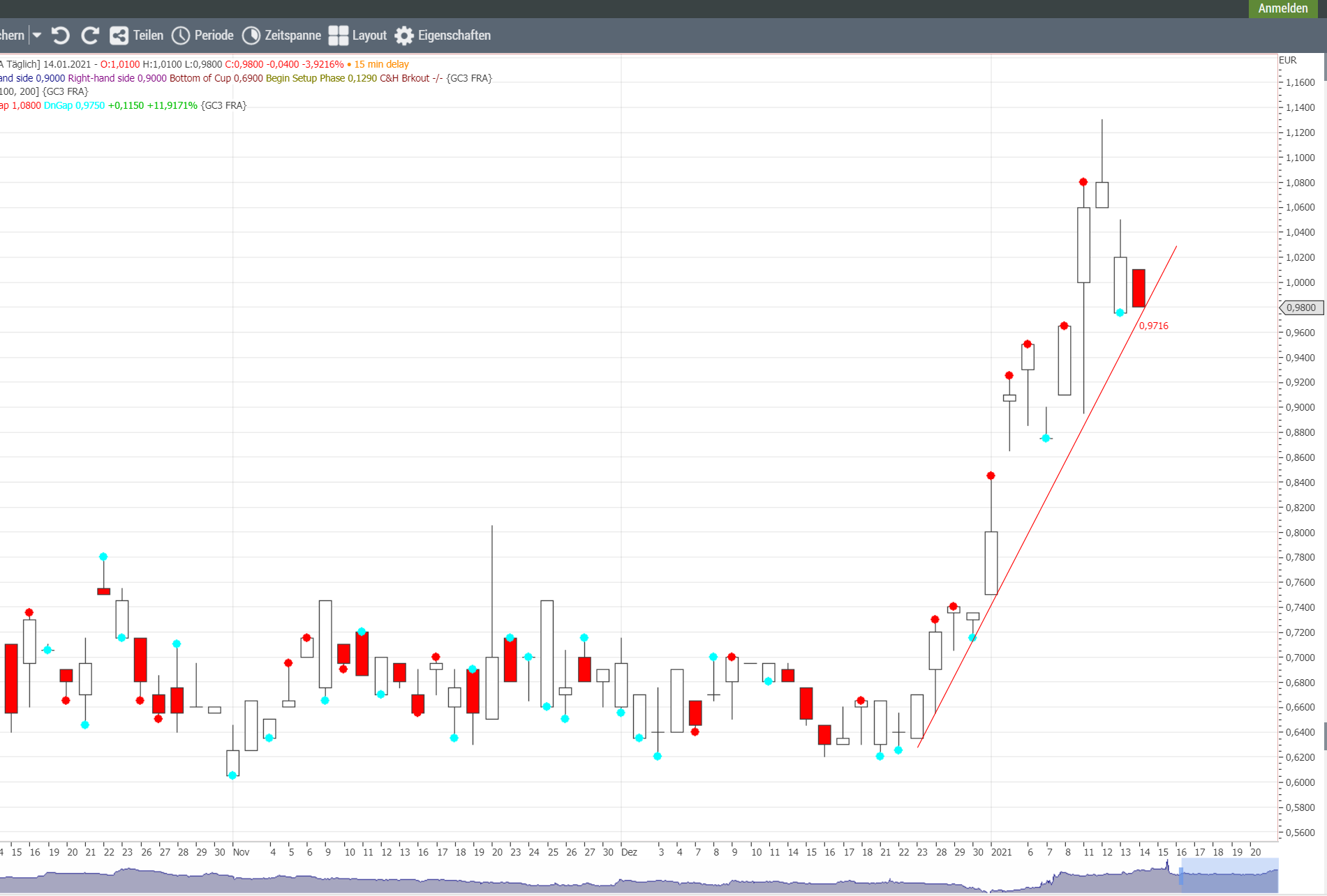 Der Chart ist aufgrund der geringen Volumina immer nur begrenzt aussagekräftig. Die Kerzen und Löcher sind tw. mehr Spurenelemente und daher nur Indizien, trotzdem hat der Wert immer seine Gaps geschlossen. Offen ist noch eines vom 05.-06.01.; es kann auch als assoziiert geschlossen gelten, wenn der Markt meint es ist zu. Das werden wir ja jetzt die nächsten Tage sehen. Gleichzeitig hat der Wert auf unteren Kante seiner jüngsten Aufwärtsbewegung aufgesetzt. Egal ob er nun nochmal von 0,85 aus startet oder im Kanal bleibt, beides sind Indizien für (bevorstehende) Kaufkurse. Ich habe meinen SL rausgenommen.