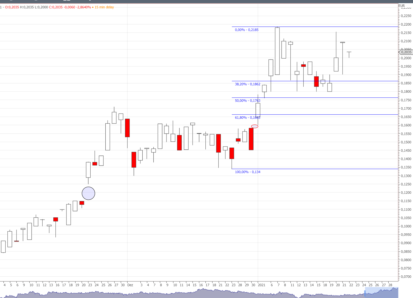 Der Kurs ist jetzt mehrfach an der 0,21€ abgeprallt, wenn er nicht zeitnah über die 0,22€ springt, bildet er ein kleines Doppeltop, was zwar nicht den Aufwärtstrend umkehrt wohl aber eine Konsophase einleitet. Hoffen wir das mal nicht, trotzdem hier mal die Marken bei einem Weg nach unten: an 0,197€ Verstärkung nach unten, kleiner Widertand (von oben nach unten) bei 0,186; bei 0,180 öffnet sich schon ein Tor bis 0,15 € dort ist bei einigen Handelsplätzen tatsächlich noch ein Gap. Falls man wirklich über einen SL nachdenkt, könnte man den (in Abhängigkeit der Steuern und EK) bspw. bei 0,178 setzen.