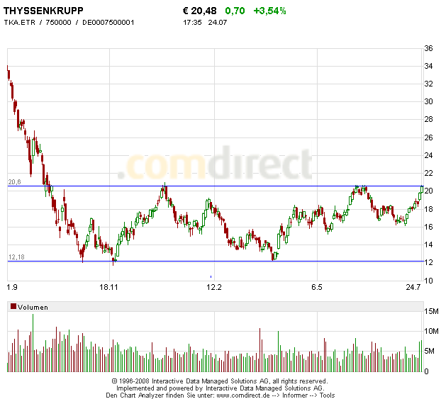 Thyssen die letztebn Tage. Nach dem kiss - back an den SP Bereich um 19,50 wo zudem der Aufwärtstrend verlief und dem anschließenden etablieren über 20 Euro gelang der 2. Sprung über die Marke von 21 Euro! Damit war der Titel kaum noch zu stoppen. Der nächste Widerstandsbereich liegt erst bei 23,20 - bis dahin ist charttechnisch fast alles frei! Der Aufwärtstrend ist weiterhin intakt und durch das Brechen der Range im Bereich 12 bis 20 Euro ist nun erneutes Potnzial, ran an 25 Euro gegeben, solnge die 21 nicht mehr unterschritten wird bzw. im daily hält - Spekulationen über eine explodierende Nachfrage aus China und einer Teilfusion mit Arcelor stützen den Kurs. Seit dem angegebenen Buylimit über 21 Euro ist der Wert bereits um gut 7 Prozent gestiegen - was bei der empfohlenden Spekulation mit weiten OS bis zu 30 Prozent gebracht hätte - im Schnitt immerhin 18! - sehr spannend zu shen wies hier weitergeht.