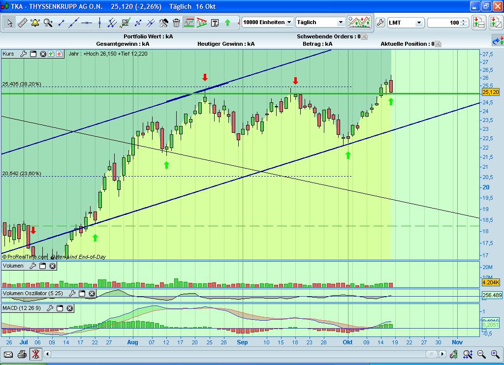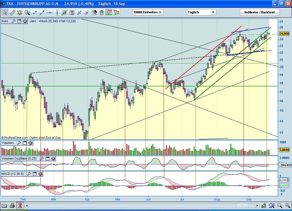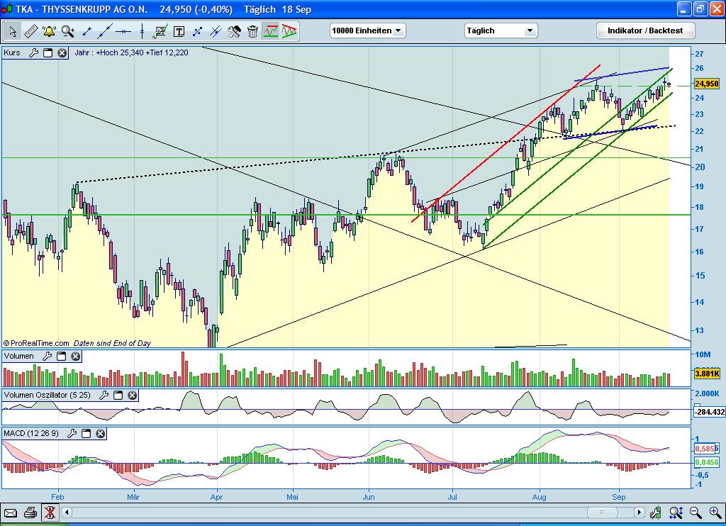 Noch ein kleiner Chart zur Thyssen Aktie. Der oben bereits gezeigte Trebd konnte sich weiterhin etablieren und wir steuern immer mehr auf seinen oberen Rand zu. Nach unten wirkt der Bereich zwischen 23 und 24,50 Euro als starker SP - nach oben ab 25,30 ein Widerstand, der nächst großere im Bereich um 26 (siehe Chart). Insgesamt setzt sich der Trend hier mit dem des Gesamtmarktes weiter fort - es bleibt im Cartbild bullisch:
