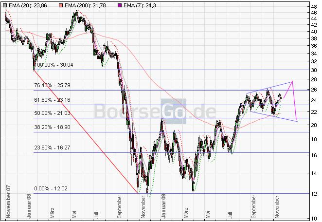 Der größte deutsche Stahlkocher Thyssen konnte vergangene Woche Freitag ein neues Jahreshoch bei 26,15 markieren, fiel dannach jedoch mit dem Gesamtmarkt erneut ab, stabilisierte sich aber oberhalb des SPs bei 24,87 Euro, welcher aus den davorigen Höchstständen entsteht. Im Chart sind nach wie vor alle Aufwärtstrends intakt und das Niveau festigt sich verstärkt, dies bei mittelmäßigen Umsätzen und durchschnittlicher Intradayvolatilität. Der nächst größere Widerstand steht bei 26,50 Euro an - darüber wäre bis an die 27,70 bzw. 28,50 Euro platz, der bei knapp 24 Euro verlaufende Aufwärtstrend dürfte weiterhin stützen, auch gibt der MACD nun ein weiter bullisches Signal, das Gesamtbild ist damit stimmig: