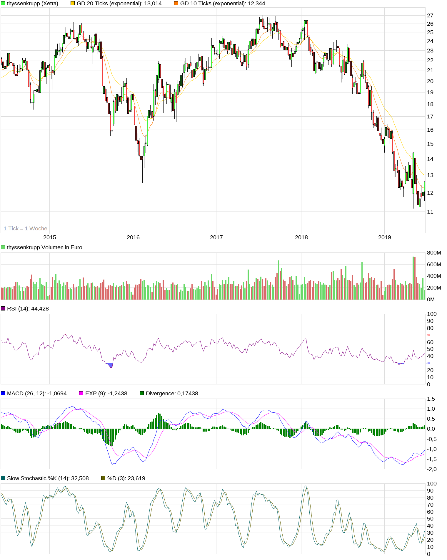 Wie weiter oben schon mal erwähnt: Seit dem 23.03.19 haben die Leerverkäufer ihre Leerverkaufsquote mehr als verdoppelt (siehe shortsell-Grafik, da heute zu sehen erst ab dem 28.März). Am 22.03.19 lag der Schlußkurs bei 12,32 Euro und heute (26.06.19) gerade eben bei 12,57. In diesen gut drei Monaten haben sie also mit der Verdopplung ihrer LV-Quote bei ThyssenKrupp-Kurs sogar schon etwas Buchverlust (25 Cent / leerverkaufte Aktie) gemacht. Das einzige was sie in diesen drei Monaten mit ihrer Leerverkauferei erreicht haben, war, daß der Kurs nicht stärker gestiegen ist. Das kann jedoch jederzeit noch kommen.