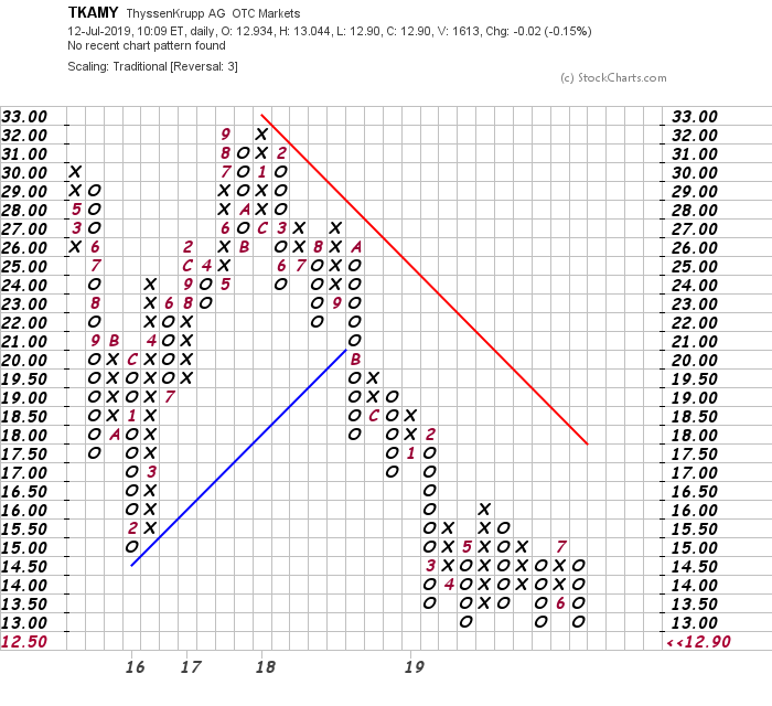 Letztlich wie schon in einigen Posts erwähnt, ist der Zeitpunkt wohl gekommen, dass Thyssenkrupp trotz deutlicher Anhebung der Short-Quote sowie negativer Analystenkommentare nicht mehr unter das Tief bei € 11,03 von Anfang Juni gerutscht ist. Das wird allgemein als Indiz gewertet, dass ein Wert tiefer wohl nicht fallen wird. Eine Marktkapitalisierung von € 7,2 Mrd. wird den in kürze ausgewiesenen deutlich verbesserten Bilanzrelationen nicht mal ansatzweise gerecht.