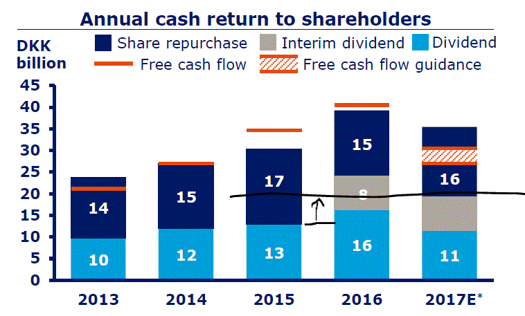 In 2017 wird nun "nur" zweimal die halbjährliche Dividende gezahlt. Im März 2017 werden geplant 4,60 DKK/ Aktie als Rest für 2016 gezahlt (11 Mrd. DKK = blauer Teil des Balkens für 2017). Und dann im August wieder eine Zwischendividende in bisher nicht benannter Höhe. Darum ist der Teil des Balkens in der Präse grau.
