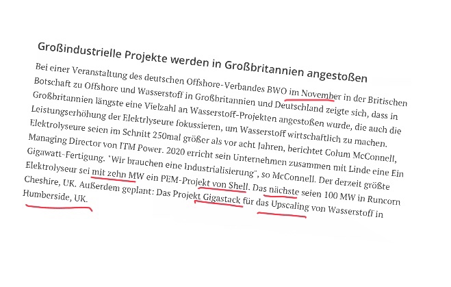 einer Machbarkeitsstudie gesprochen. Die Phase 1 war im Jahr 2019 und es wurde durch ITM ein Entwurf für den Elektrolyse Stack fertiggestellt. Danach gibt es noch eine FEED Studie für den Einsatz einer Raffinerie . Das Projekt befindet sich alles noch in Planung auf dem Papier. Ein Baubeginn wird noch nicht genannt . Also werden Teil - Einnahmen aus dem Projekt erst im Laufe des Jahres 2021 - 2022 kommen.