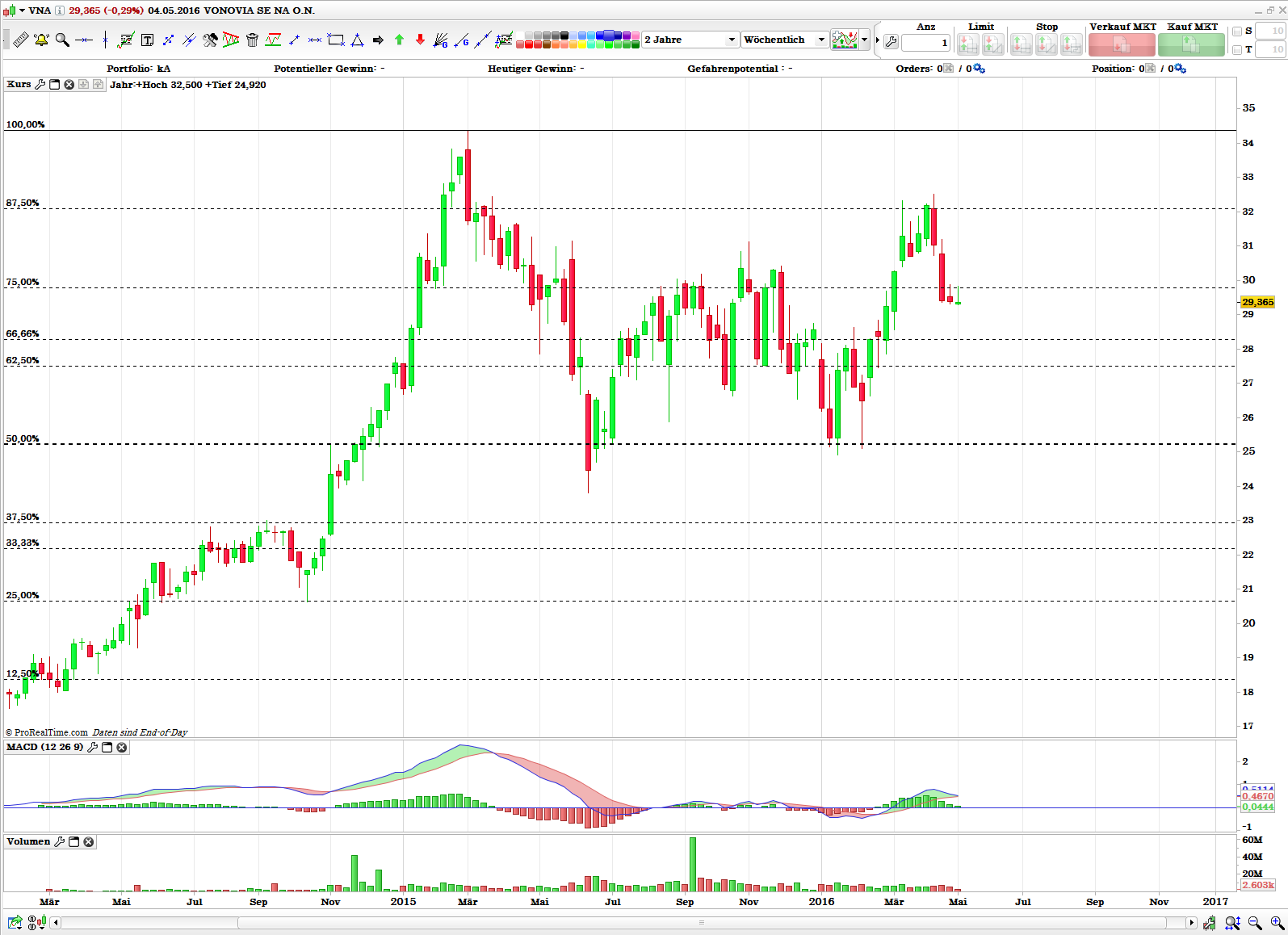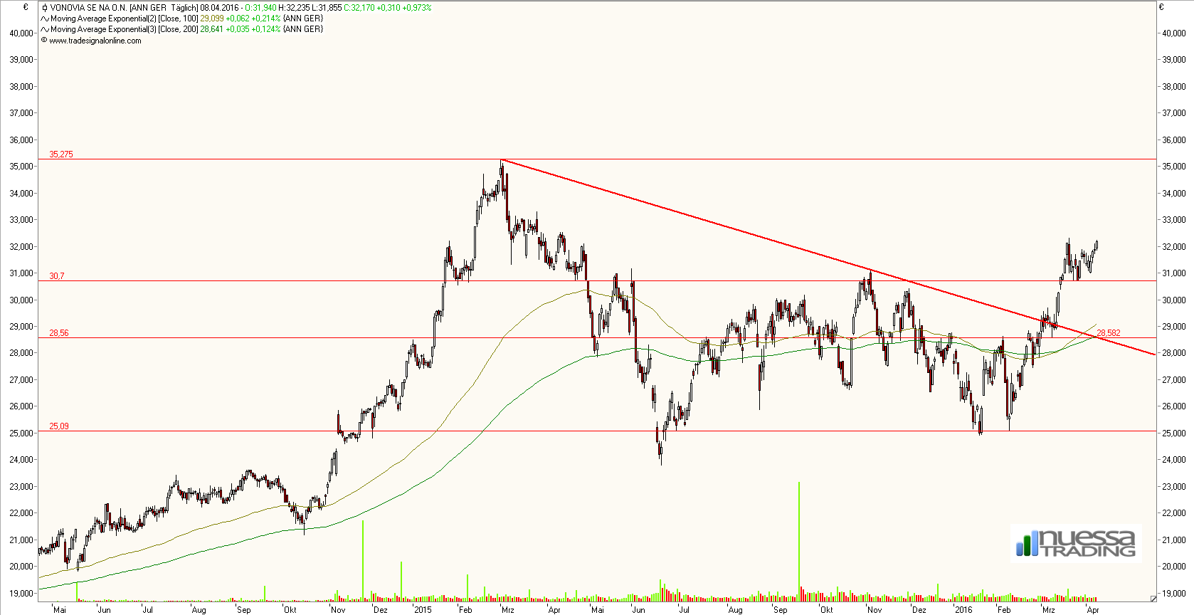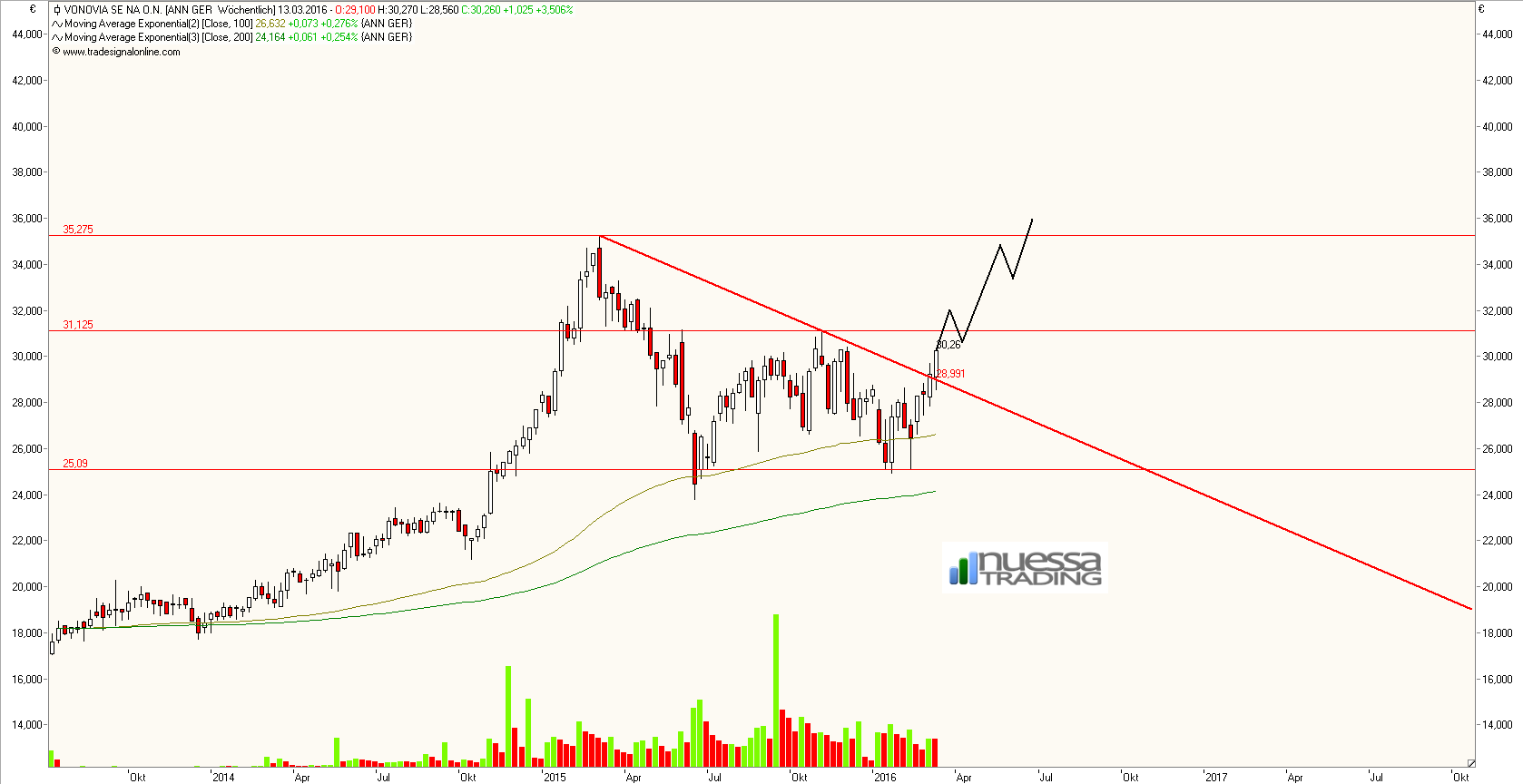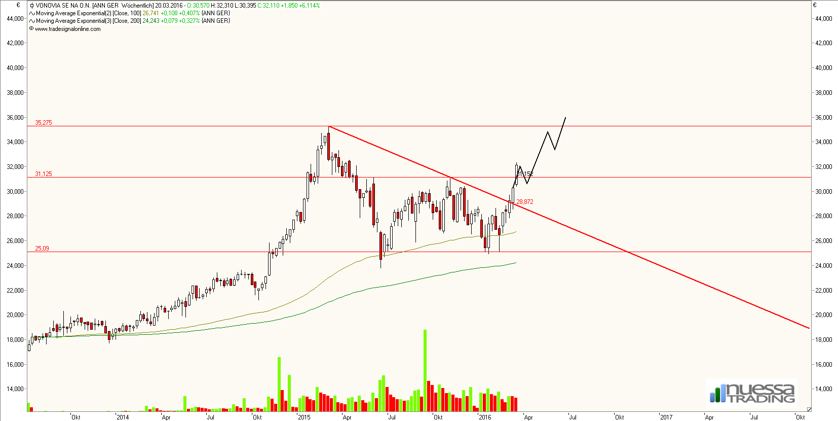 Die Aktie könnte den fulminanten Anstieg im Jahr 2014 nunmehr ausreichend korrigiert haben. Sollte die Aktie nachhaltig über 31,15 € ansteigen können, stehen die Chancen sehr gut, dass die bisherigen Hochs getestet werden. Dazu sollte die Aktie nicht mehr unter 25 € schließen.