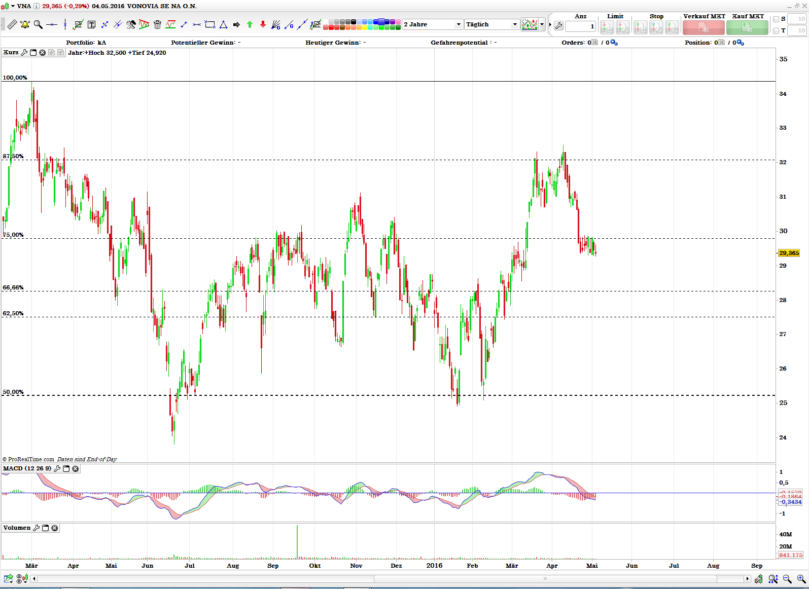 Die Aktie scheint noch nicht genug zu haben. Die Bewegung ist im vollen Gange. Für jmd. der diese handeln möchte empfiehlt sich die angelaufenen Gewinne mit einen StoppLoss bei einem Schlusskurs unter 30,40 € abzusichern.