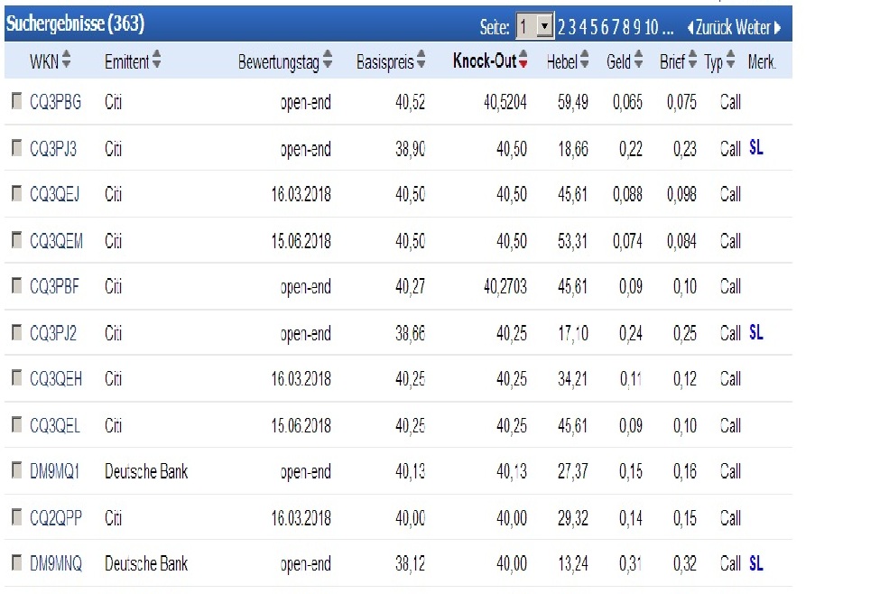 Banken-interesse bis dahin , alles calls in Liste , zertifikate mit Datum > 6 Wochen. sieht so aus, als muesste da vieles unter die ko-schwelle 40.50 gedrückt werden bis dahin, die DB steht sehr ungünstig da mit ko 40,13 Hab ja in aktien investiert, und kann mir nicht vorstellen, das die Art investoren hier diese Drücker-Sachen beeindruckt . die folgende Liste macht die Sachlage klar für die beiden Banken citi und DB, die müssen viel geld abdrücken, wenn die Zocker richtig liegen.