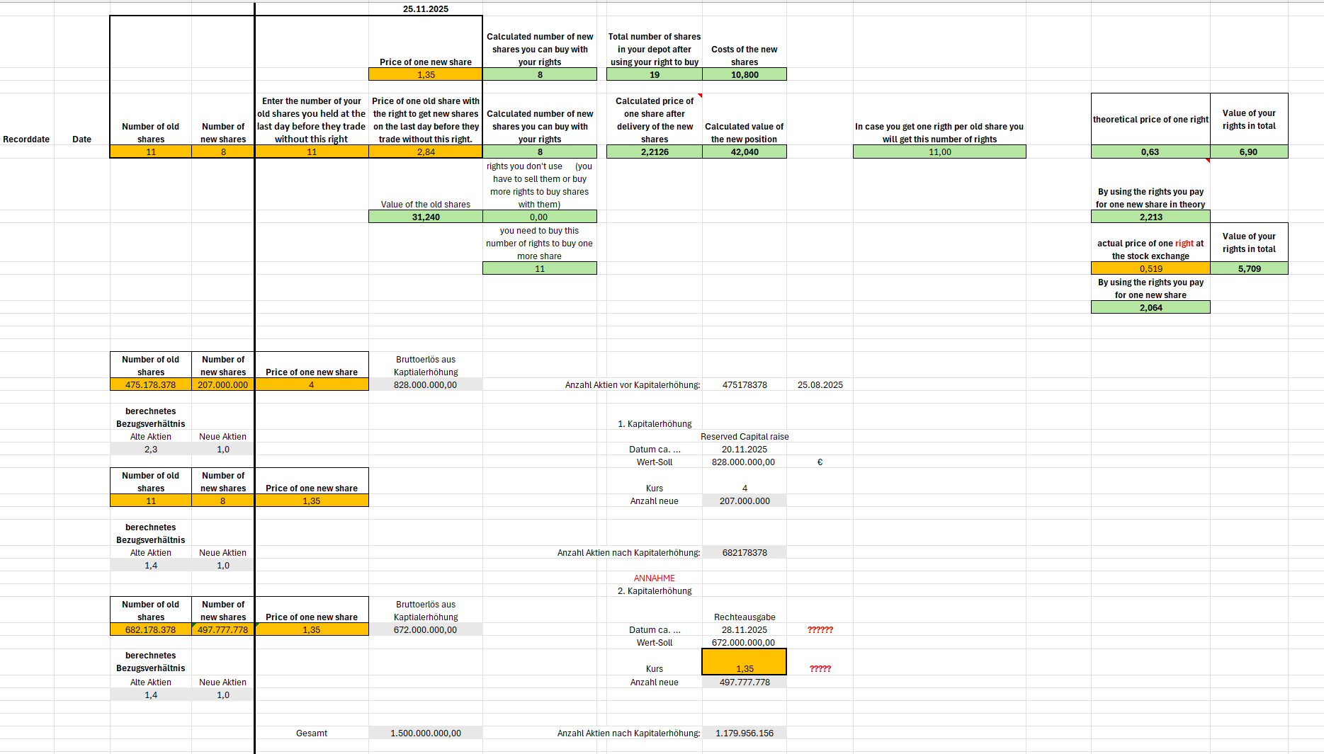 207 000 000 Aktien in 1. Kapitalerhöhung entspricht 828 Mio Euro kommen zur Firma hinzu in cash! 497 777 778 Aktien zu 1,35 Euro 2. Kapitalerhöhung ca. 670 Mio kommen zur Firma hinzu in cash!