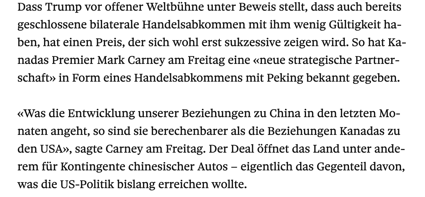 das zitat zum montag vom kanadischen premier carney: was die beziehungen zu china in den letzten monaten angeht, sind sie berechenbarer als die kanadas zu den usa....