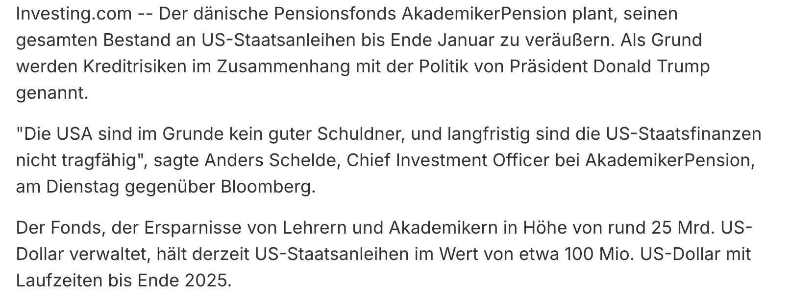 während es draussen weiter frostig bleibt, ist die STimmung in den politischen Kanälen auch weiter frostig. Passt als Anekdote auch zum Thema Grönland, wenn auch Trump etwas versöhnliche Worte angeschlagen hat. Alles wartet nun auf seine Rede und man wird Silbe für Silbe interpretieren. Genug Futter also um die Märkte und damit den Versteigerungsprozess zu befeuern.