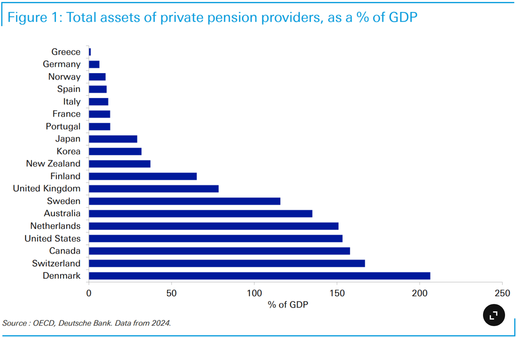 "Augenfällig ist der relativ mickrige Anteil privater Vorsorgegelder in Deutschland mit gerade mal 9% des BIP. Die gesetzliche Rentenversicherung, die im Umlageverfahren finanziert wird, deckt den Löwenanteil der dortigen Vorsorge ab. Dabei läuft das Land einer demografischen Bombe zu. Die private Vorsorge wurde viel zu lange vernachlässigt, respektive die Riester-Rente wurde in der Bevölkerung nie als valable Ergänzung angenommen. Hohe Komplexität und Kosten, gepaart mit einem schmalen Ertrag, wirkten abschreckend. Aktuell wird an einer Reform der privaten Altersvorsorge in Deutschland gearbeitet."