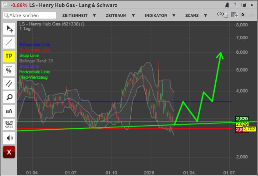 Ariva hat den ersten Versuch verschluckt, so halt in kurz für alle: DE000DY3ZDL8 ... OS long auf Erdgas, Einstieg 0,33€, SL 0,23, TP rd. 2€ Risiko -50%, Gewinnmöglichkeit +500% - CRV etwa bei 10 Ist ein Zock der darauf abzielt, dass unsere politischen Führer es wieder mal verkacken und im Sommer die europäischen Speicher zu einem guten Preis (für die Wirtschaft, natürlich nicht für die Kunden) anfüllen werden. Vielleicht hat ja auch der ein oder andere von Euch iwo in der letzten Zeit Wörter wie Gasmangellage, Iran-Konflikt o.ä. wahrgenommen und wie schon geschrieben glaube ich nicht, dass hier was vernünftig geregelt wird. Einziges Risiko für diesen Trade ist mMn die erneute Inbetriebnahme von Nord-Stream 1 oder 2, aber das will doch niemand wirklich, da wir den pööösen Russki ja bestrafen/sanktionieren müssen. Find ich zwar doof, kann's aber nicht ändern und so möchte ich wenigstens was verdienen, wenn's kommt wie befürchtet. Das war's von meiner Seite - wünsche Euch Alles Gute, erfolgreiche Trades und falls wer seinen Senf zu meiner Idee da lassen möchte bitte gerne....
