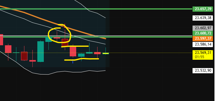 Der Dax hat jetzt das uBB nach unten hin durchbrochen, aber bis zum uBB im 60er bei ca. 23.500 fehlen noch ein paar Punkte. Im 240er ist der Dax vorerst mit seinem Erholungsversuch am mBB gescheitert. Aber bei der Vola in den letzten Tagen kann sich das auch wieder schnell ändern.