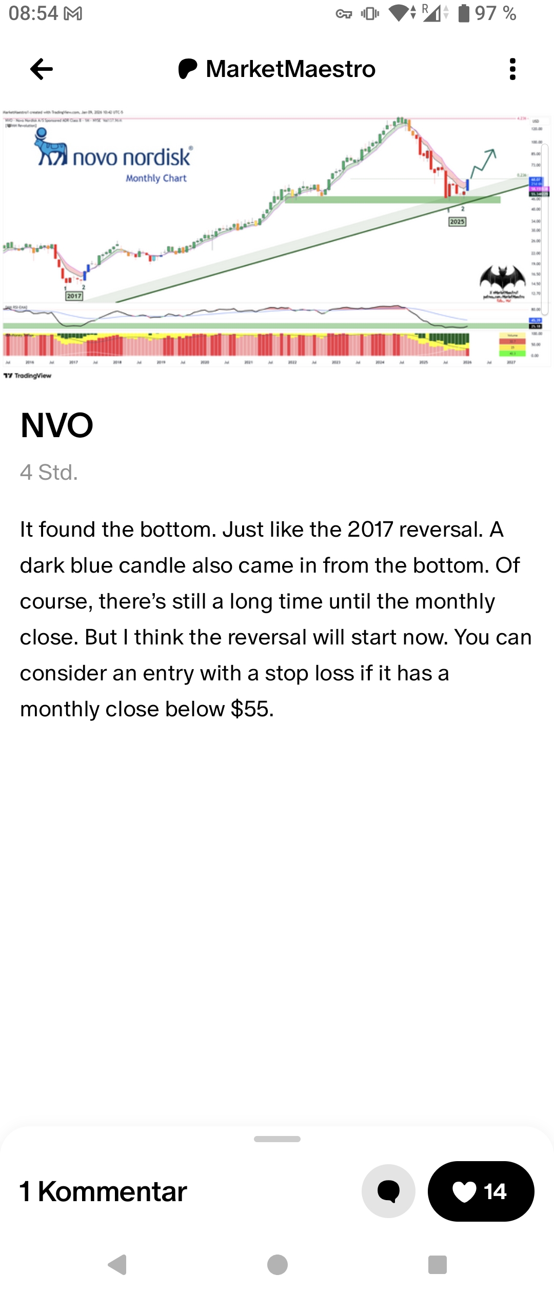 ...hängt jetzt ziemlich genau an der 200-Tage-Linie. Meinen KO-Schein habe ich jetzt extrem eng abgesichert; wäre nicht überrascht wenn die Aktie an der Linie kleine Probleme bekommt. Schein mehr als 100% im Plus. Aktie selbst behalte ich weil ich davon ausgehe, dass noch ein langer Weg nach oben bevorsteht.